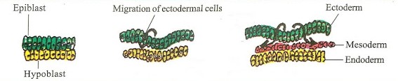 the cells of epiblast, i.e. pluripotent cells migrate towards the